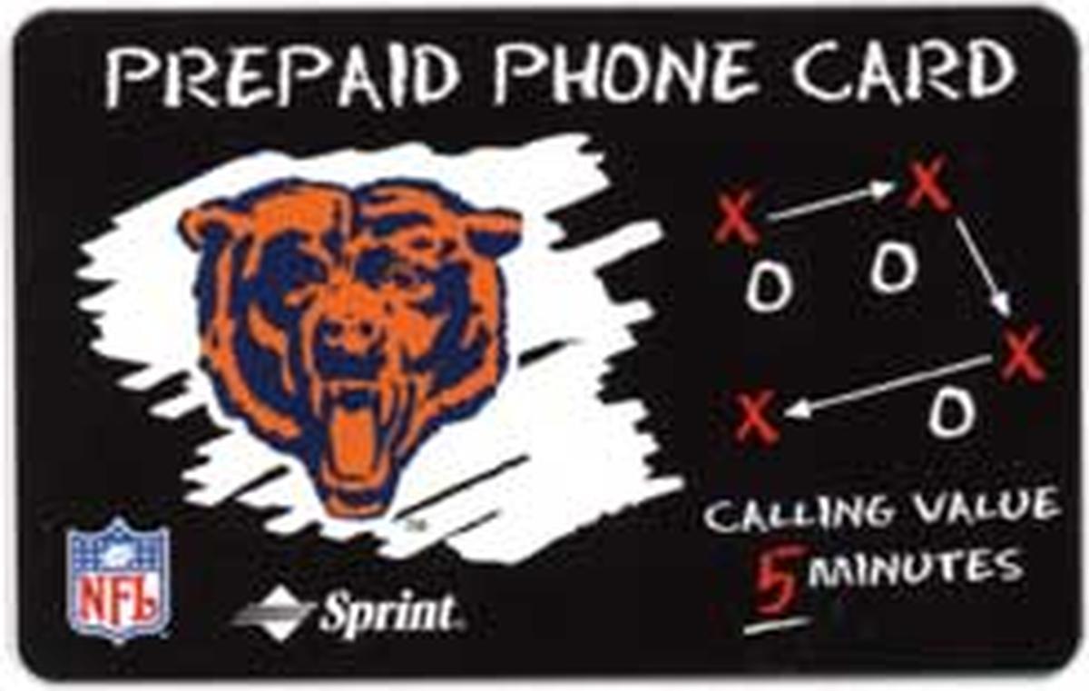 At the top right corner, the card indicates that it is a 5-minute prepaid phone card for use with Sprint’s network service. The word “NFC” appears in white text, referencing the National Football Conference, one of the two conferences in the NFL. The card showcases strong branding associated with NFL football and the Chicago Bears, emphasizing Americana sports culture.