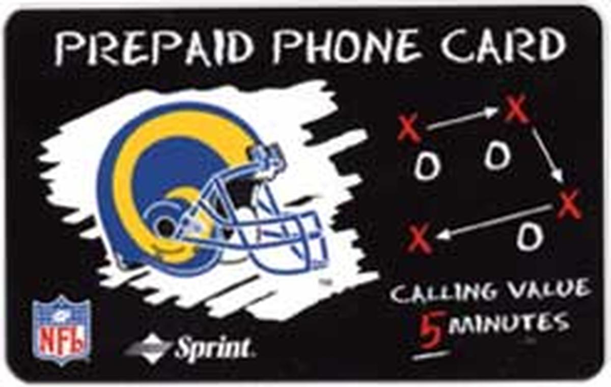 This collectible prepaid phone card prominently features the logo of the St. Louis Rams, a former National Football League (NFL) team. The Rams’ logo is shown in full color with the stylized ram head in gold and blue, positioned on a white background. Above the logo, the card displays the text “NFC 5M Prepaid Phone Card,” indicating its value and network association.