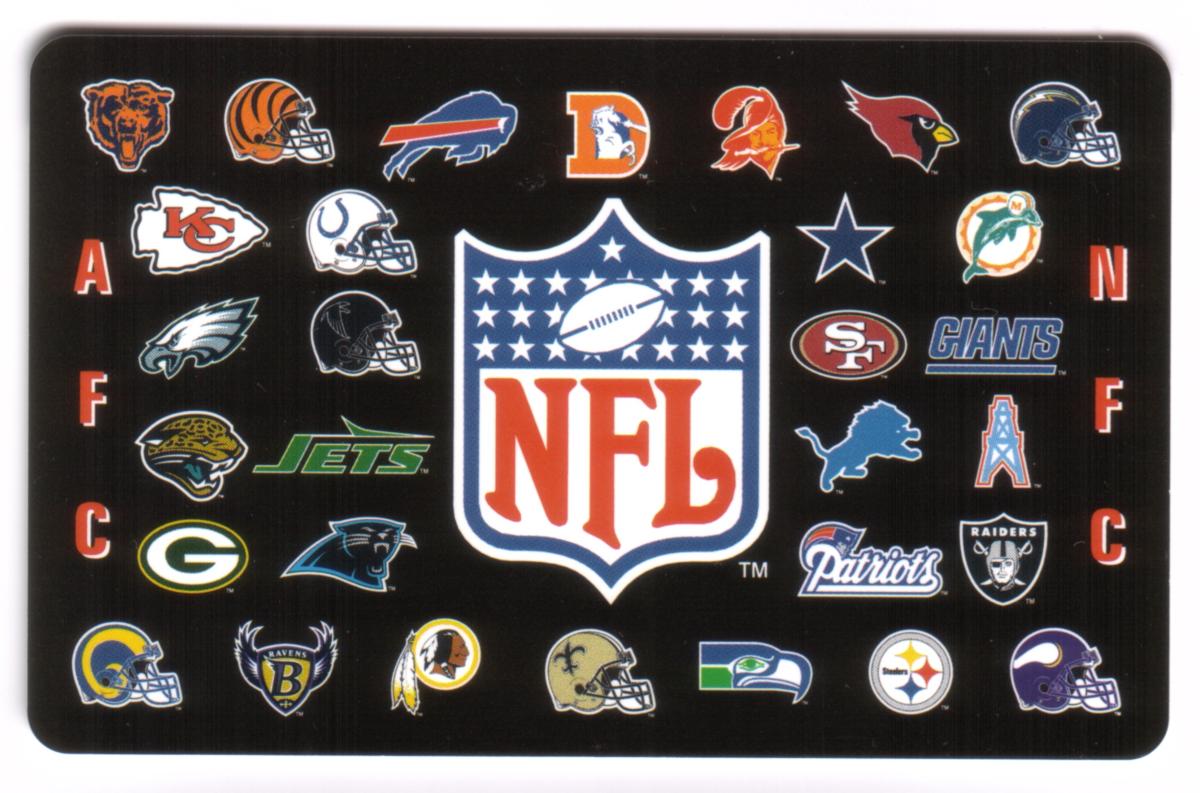 This collectible prepaid phone card from Sprint features an intricate design highlighting 30 different logos from both the American Football Conference (AFC) and the National Football Conference (NFC) teams within the National Football League (NFL). The logos are arranged across the entire card in a grid-like pattern, each emblem clearly representing its respective NFL franchise. These logos showcase vibrant team colors and distinctive designs, ensuring each team is prominently displayed.