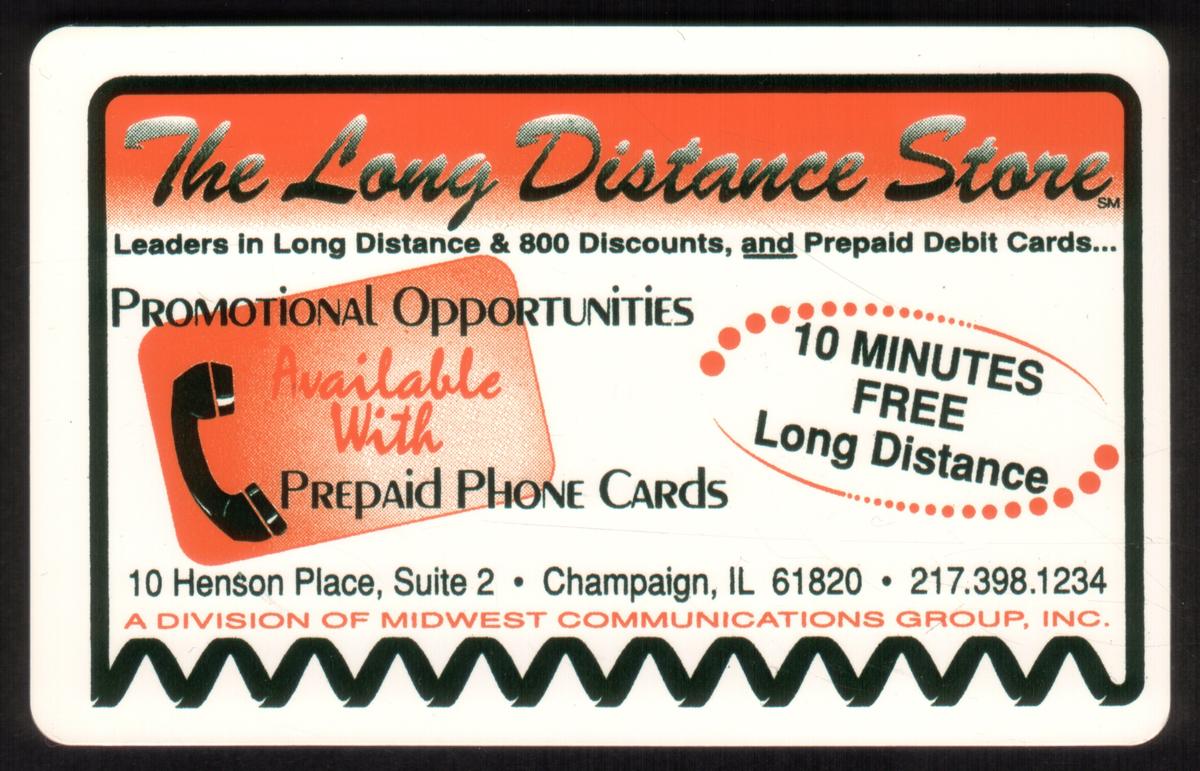 This collectible phone card prominently features the logo and branding of WorldCom, a major telecommunications company. The card displays an image of telephones, highlighting the theme of communication technology. The design includes the words "The Long Distance Store," referencing a service related to long-distance calling, with a specific mention of Champaign, Illinois, indicating its Midwest Communications Group affiliation.