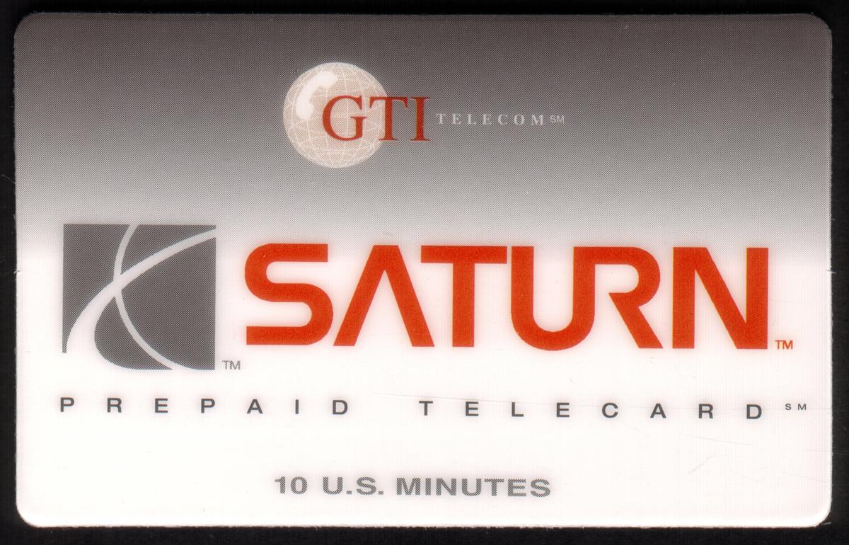 This collectible phone card features the logo of Saturn Automobiles prominently in the center. The logo consists of a stylized silver ring encircling a red rectangular shape with a diagonal curved line suggesting the planet Saturn’s ring system. The background is a smooth gradient of silver and gray tones, emphasizing the logo’s metallic effect. Above the logo, the text "GTI Telecom, Inc." appears clearly in white lettering, identifying the telecommunications company associated with this card.