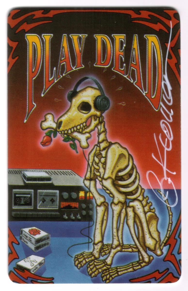 This collectible phone card features an artistic illustration related to the Grateful Dead and music themes. The central image is a yellowish skeleton of a dog sitting upright and wearing large black headphones, holding a dog bone with a red rose in its mouth. The dog skeleton is detailed with visible bones and shadowing that gives depth, and it appears to be listening intently.