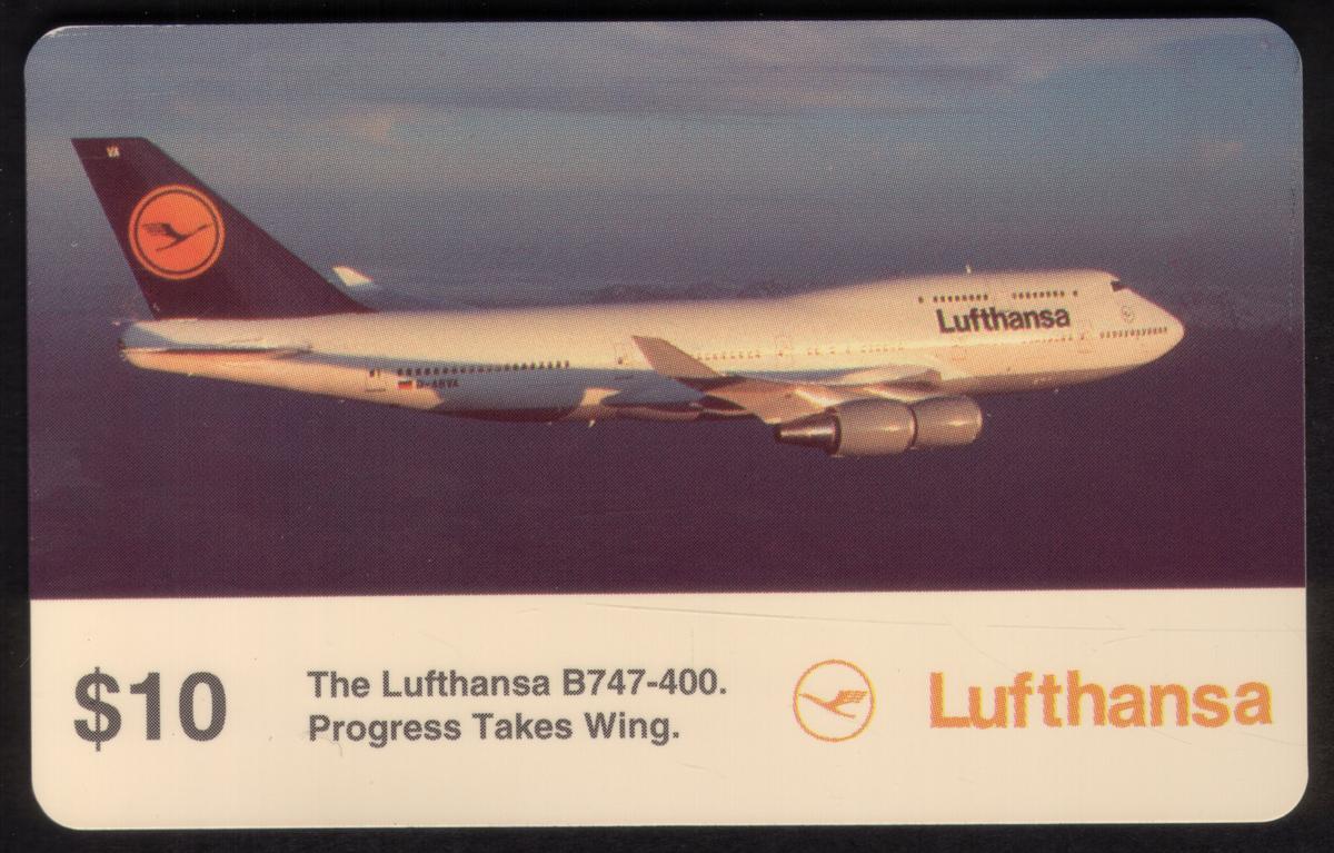 Keywords related to the card include aviation, aircraft, airplanes, transportation, sightseeing, and Boeing 747. Lufthansa Airlines is the operator of the jumbo jet featured, reinforcing the collectible’s focus on commercial flight and long-distance air travel. This card does not deviate from credit card dimensions nor does it present itself as jumbo size; it is a standard credit card size collectible.
