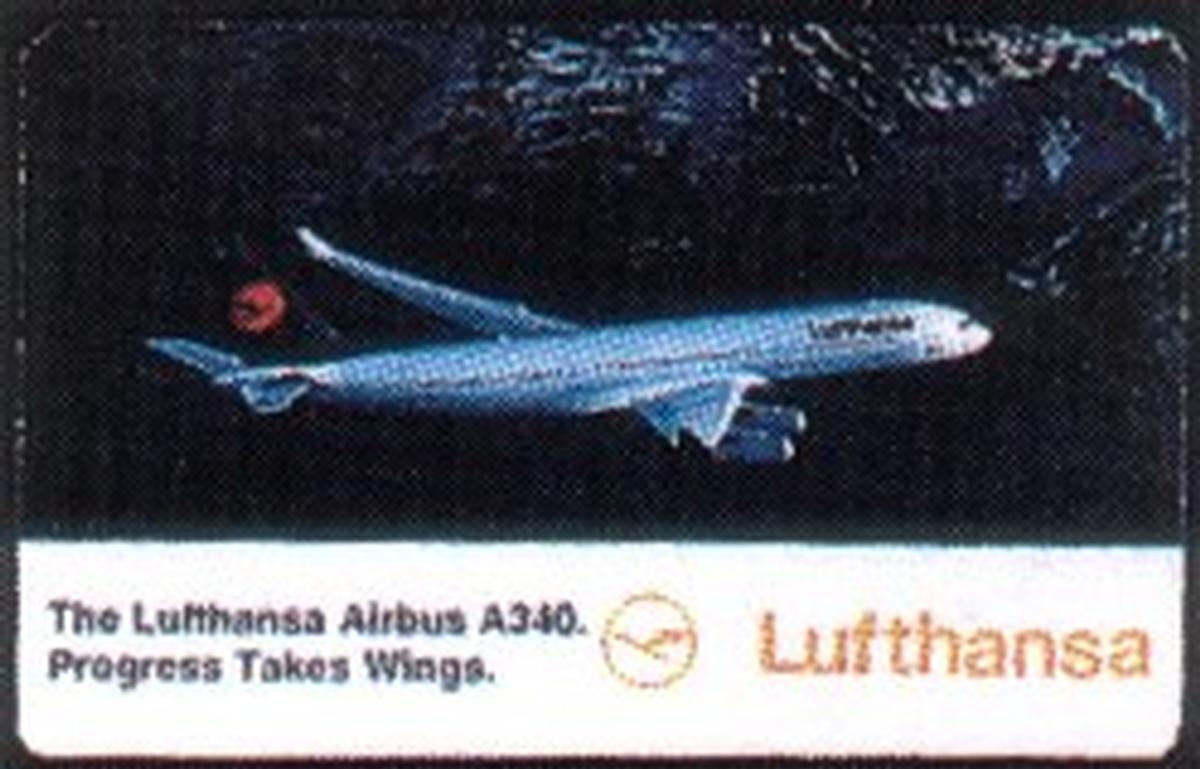 Additional design elements include a globe symbol integrated into the layout, reinforcing the global reach of Lufthansa and its role in transportation and sightseeing. The card’s overall color scheme features shades of blue and white which complement the airline’s branding. The card is a collectible item connected to aviation, airplanes, and transportation themes.