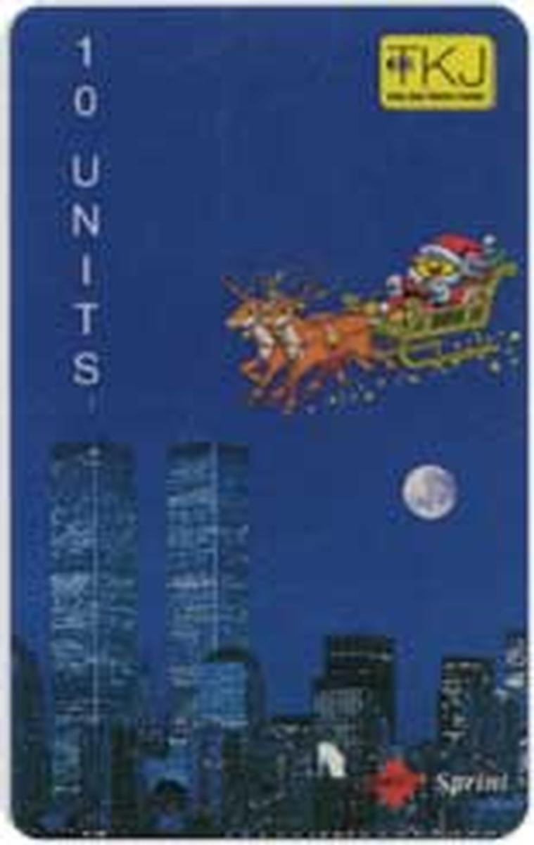 Santa’s sleigh is depicted mid-flight, with reindeer leading the way, evoking the festive spirit of Christmas. The card includes the text "10u TKJ Christmas" along the bottom edge, indicating its value and theme. The Sprint logo is present in the upper left corner, identifying the telecommunications provider associated with the card.