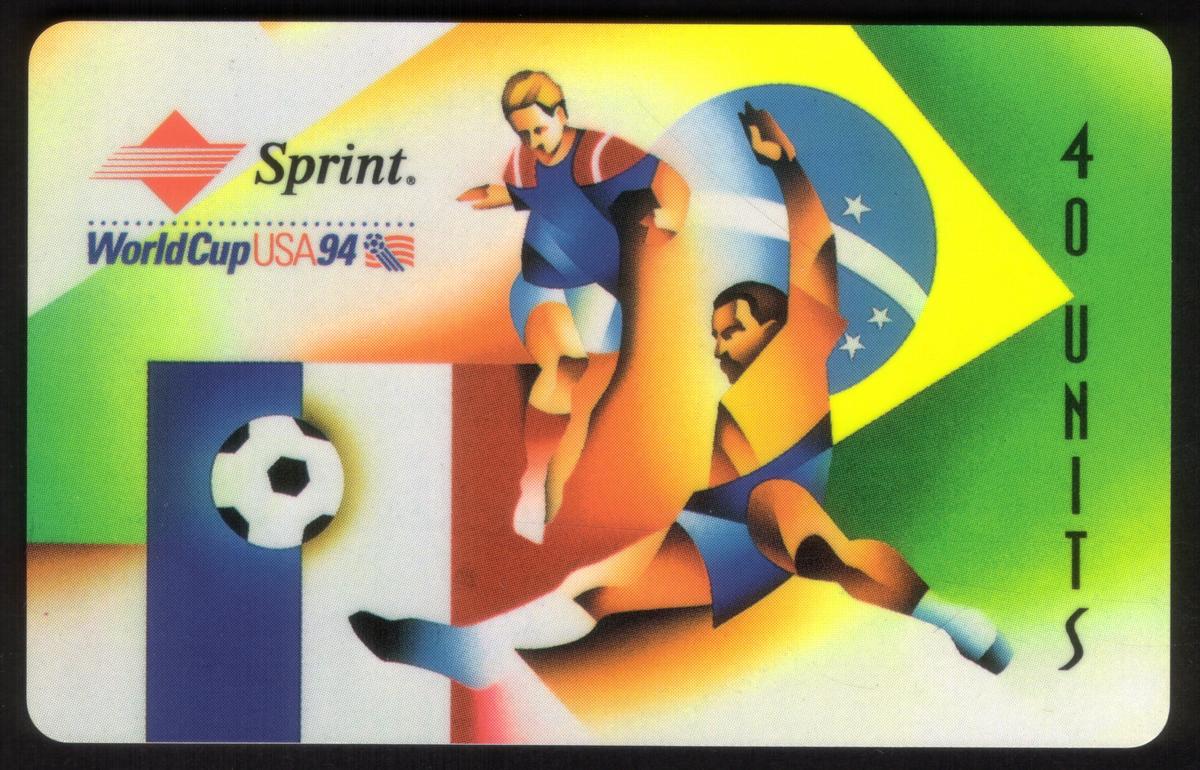 Prominently displayed near the upper left corner are the logos for Sprint and WorldCup USA 94, with a small American flag beneath the text. The vertical text along the right edge reads "40 UNITS," indicating the card’s value. The overall presentation highlights the international soccer event and specifically references the World Cup 1994, Brazil, and France in its imagery and text.
