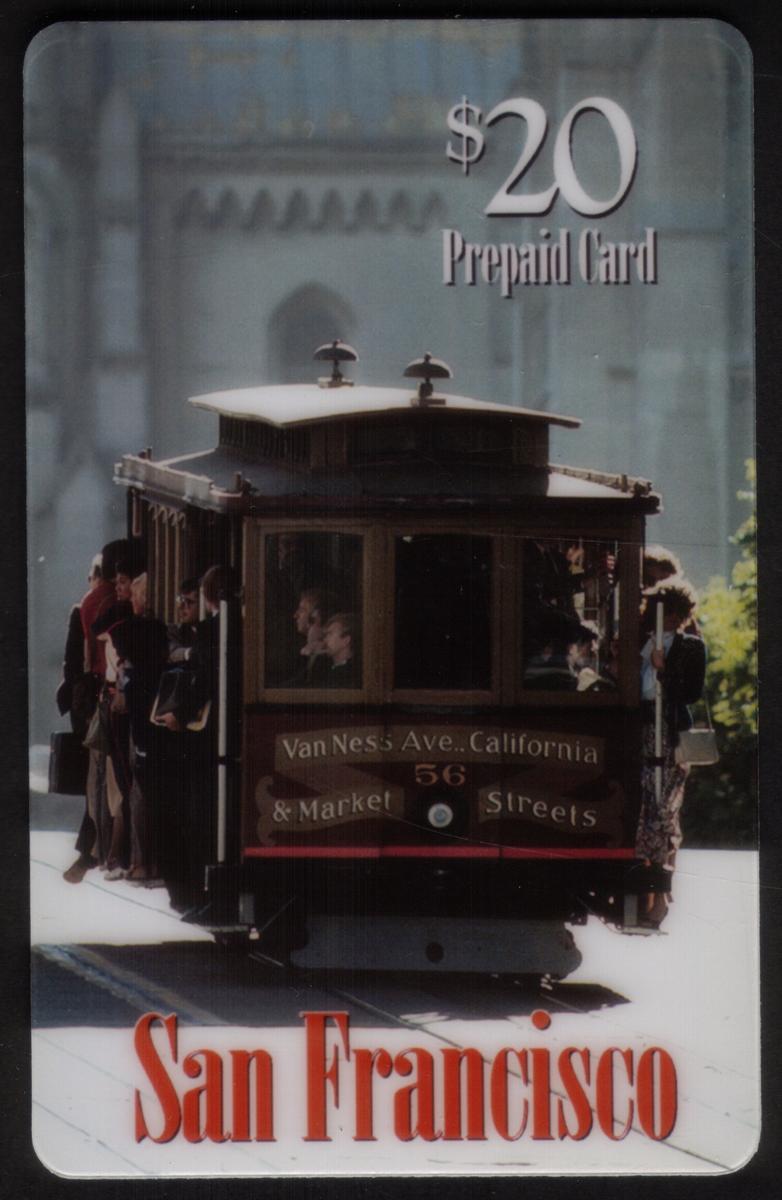 The card is a proof edition linked to TeleDebit, indicating its connection to telecommunications or payment services. It is blank on one side, bearing a face value of $20, and the overall design emphasizes travel and sightseeing within the iconic market streets of San Francisco. The card’s front includes textual elements identifying the cable car and its route on Van Ness Avenue.