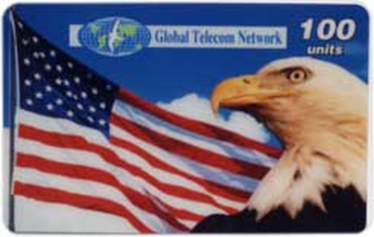 Keywords: promotional, user card, Americana, American symbols, American symbolism, American flags, USA, US flags, eagles, stars and stripes, red white and blue, patriotism, birds, ldds worldcom, grapevine telecards, global telecom network, Global Tel. LDDS GRP
