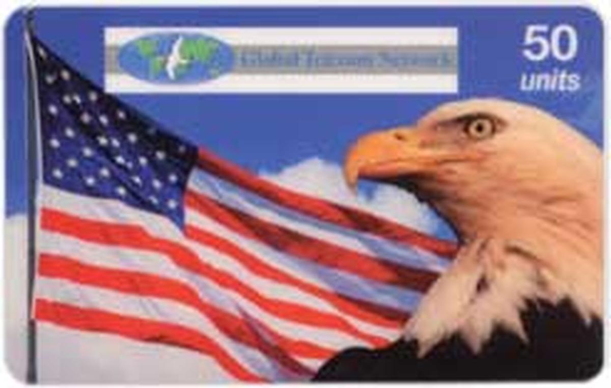 The card includes the logo and lettering for LDDS WorldCom, a global telecommunications company, integrating it within the composition. The text “50u GTN Flag & Eagle” appears on the card, referencing the card’s value and the Global Telecom Network (GTN). The grey highlight over the GTN logo contributes to the card's sleek, professional aesthetic. The combination of the symbols—the US flags, eagle, and corporate branding—tie together a theme that is both nationalistic and representative of a major global telecom provider.