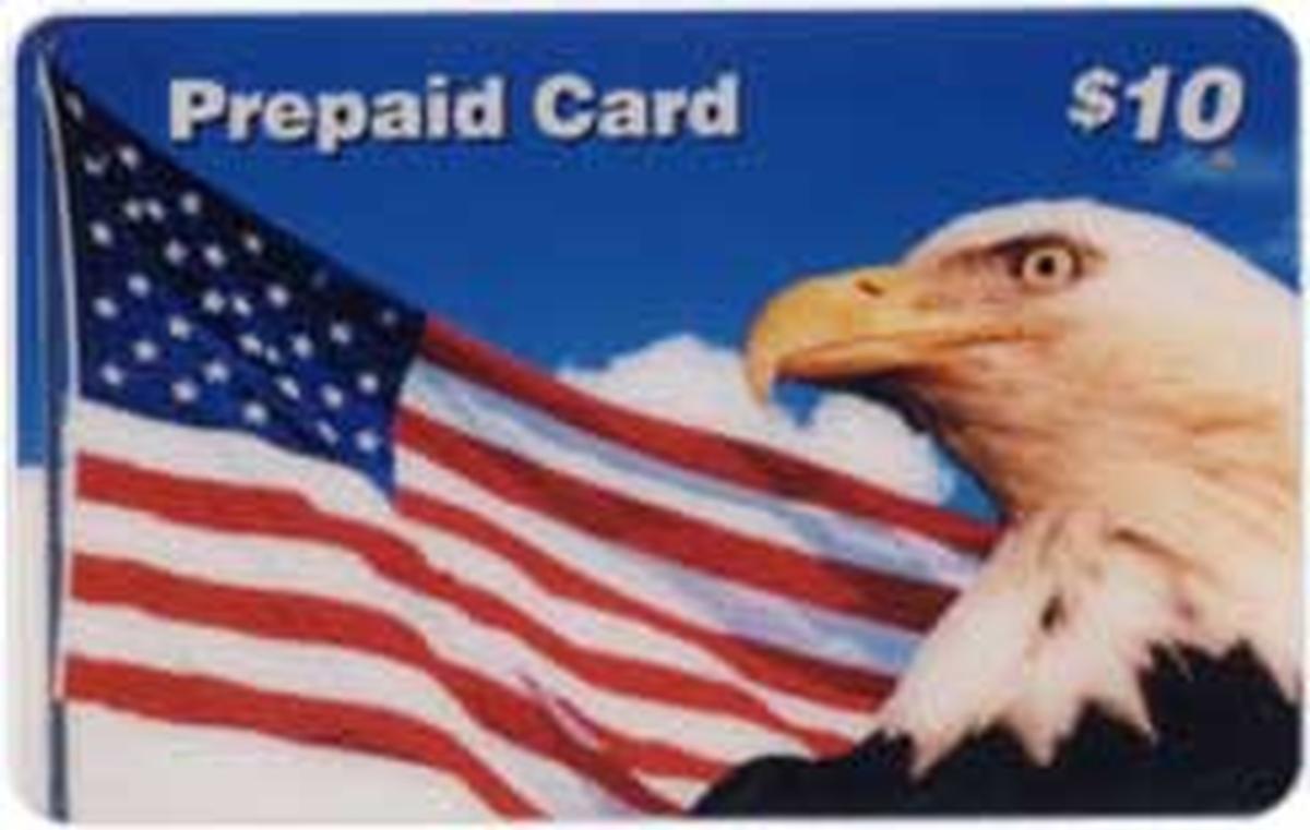 Patriotic $10 prepaid card featuring the American flag and bald eagle with bold red, white, and blue colors, symbolizing freedom, strength, and national pride. |