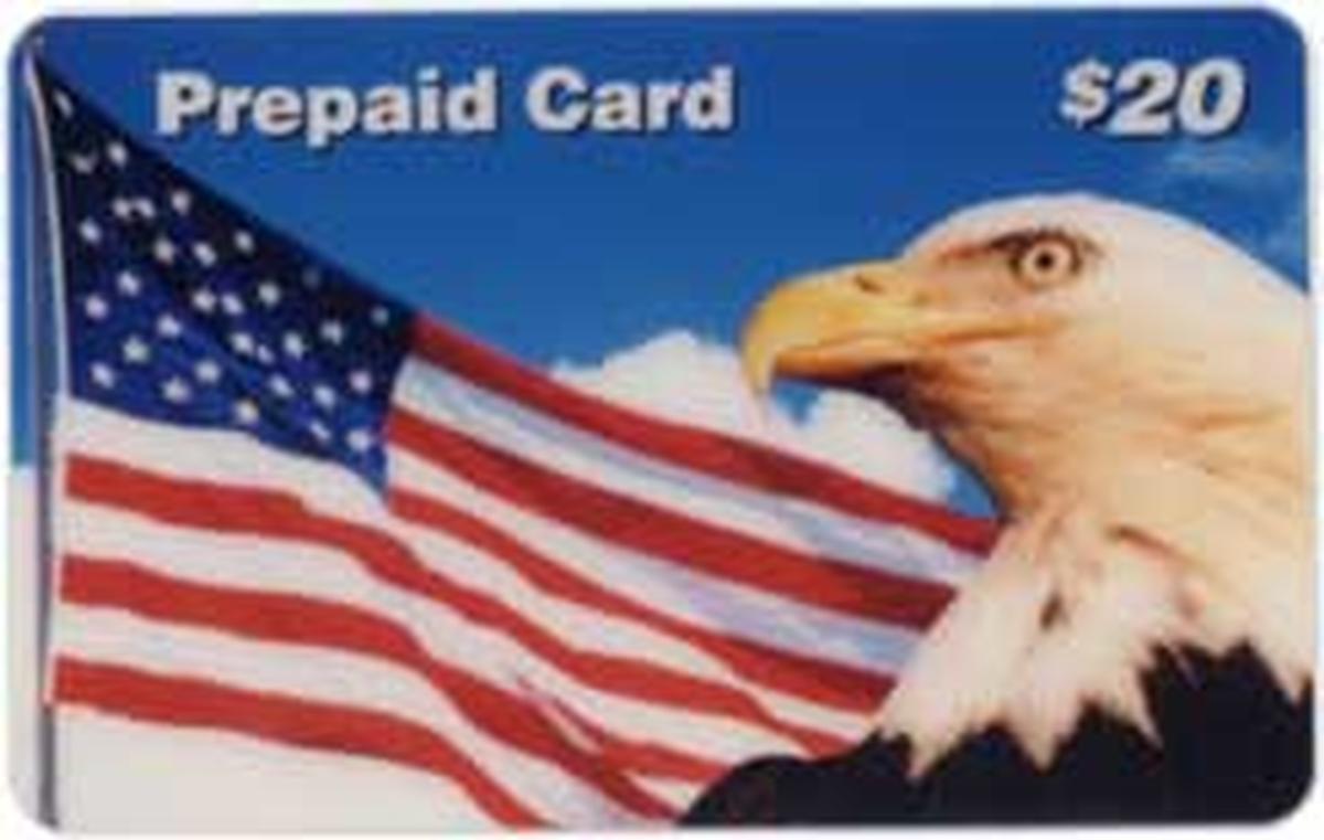 This collectible phone card features a patriotic Americana design emphasizing American symbols. The central image showcases a bald eagle prominently positioned over a background of multiple American flags, displaying the stars and stripes in vibrant red, white, and blue colors. The detailed depiction of the eagle captures its fierce and majestic appearance, symbolizing strength and freedom in the United States. Surrounding the eagle and flags are stars that further enhance the patriotic theme.