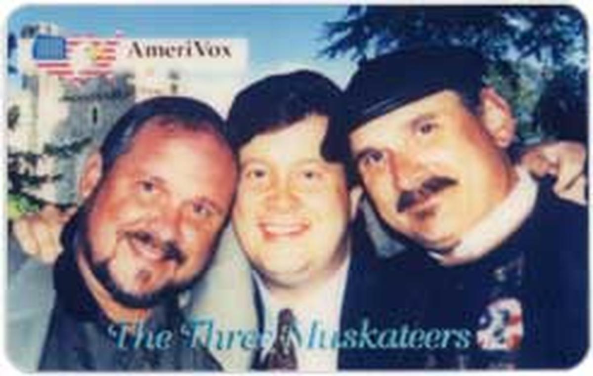 The front of the card displays the title "The Three Muskateers" in quotation marks, referring to Larry Brilliant, Barry Brilliant, and David Michael Eastis. Their names appear clearly, associating them as the central figures celebrated on this card. The design includes graphic elements that visually tie these figures to the development and leadership within the telephone card and print industries. The term "google philanthropist" appears, referencing a modern tech connection, alongside AmeriVox ownership, indicating the multifaceted contributions of these key players.