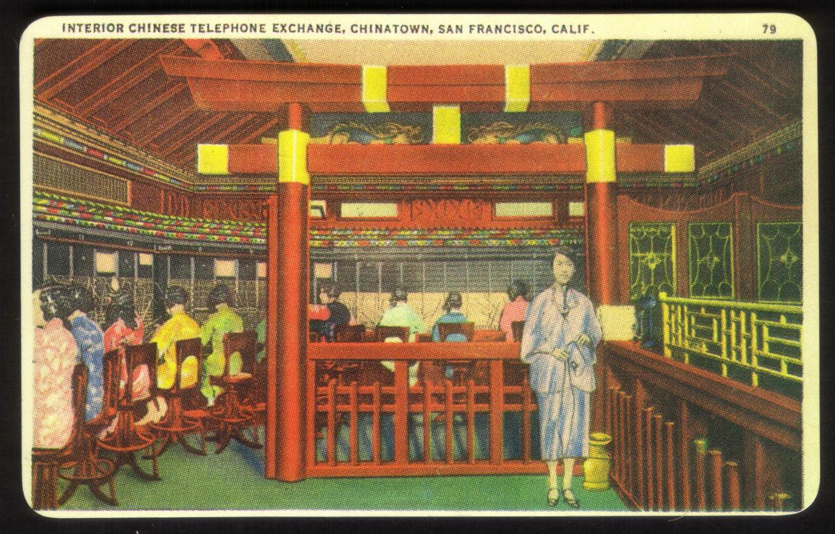 This collectible chip card features the interior of the Chinese Telephone Exchange located in Chinatown, San Francisco, California, dated 1906. The scene captures a room filled with numerous telephone operators seated on wooden chairs in front of switchboards. The architectural style prominently includes large red pillars with yellow accents, and the ceiling beams and upper walls are richly detailed with wooden patterns and colorful designs.