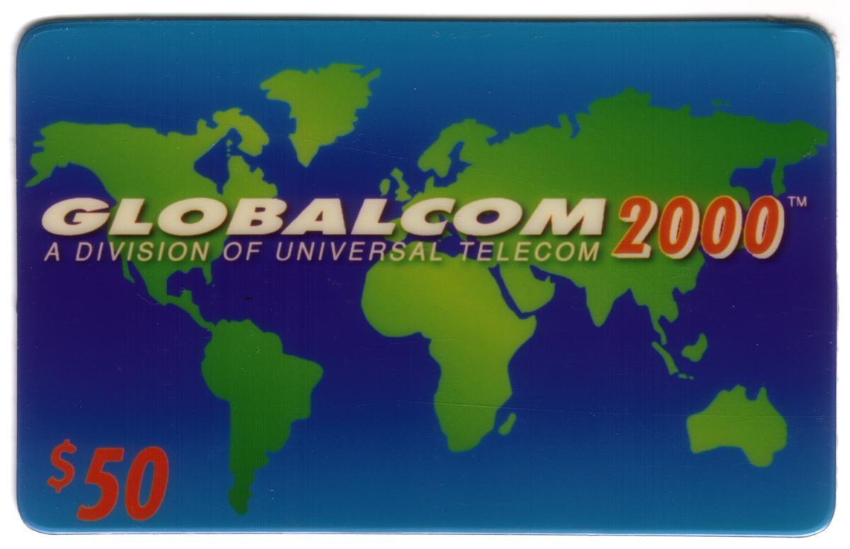 Prominently visible on the card is the USTel logo alongside the text "USTel $50," indicating the card’s value. The words "Globalcom 2000" appear clearly, associating the card with the telecom provider. The overall layout combines the map graphic with branding elements relating to Universal Telecom and USTel, which are key components of the design and identity of this phone card.