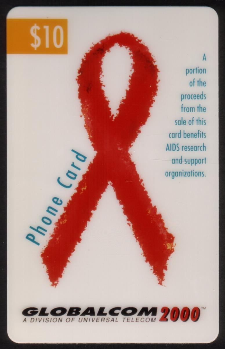 This collectible phone card features a prominent red AIDS awareness ribbon on an orange background, symbolizing support for AIDS-related causes and health awareness. The ribbon is centered on the card, creating a strong visual focus that highlights its significance in supporting global health initiatives.