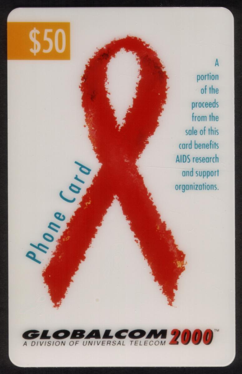 The overall design emphasizes themes connected to fundraisers, non-profit organizations, and health causes associated with diseases. The combination of the AIDS ribbon, the denomination, and identifying details such as the phone number and issuer make this card a collectible related to medical fundraisers and health awareness campaigns.
