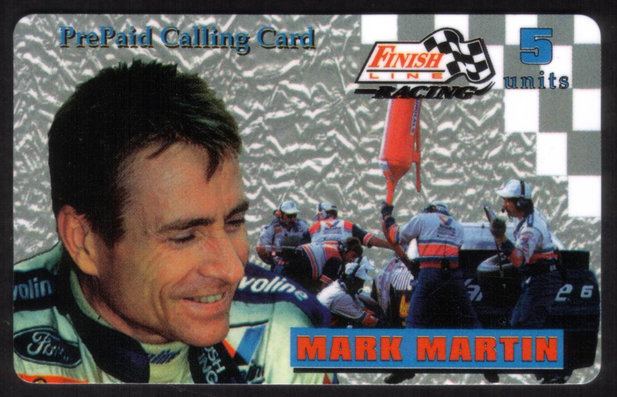 The card has a textured silver-gray background with a checkered flag pattern on the right edge. The text "PrePaid Calling Card" is printed at the top in blue. Near the top right corner, the "Finish Line Racing" logo is displayed, featuring a checkered flag motif. Below the pit stop scene, a blue and orange box contains the name "MARK MARTIN" in capital letters. The number “5” and the word "units" are printed in blue near the upper right corner, indicating the prepaid value.