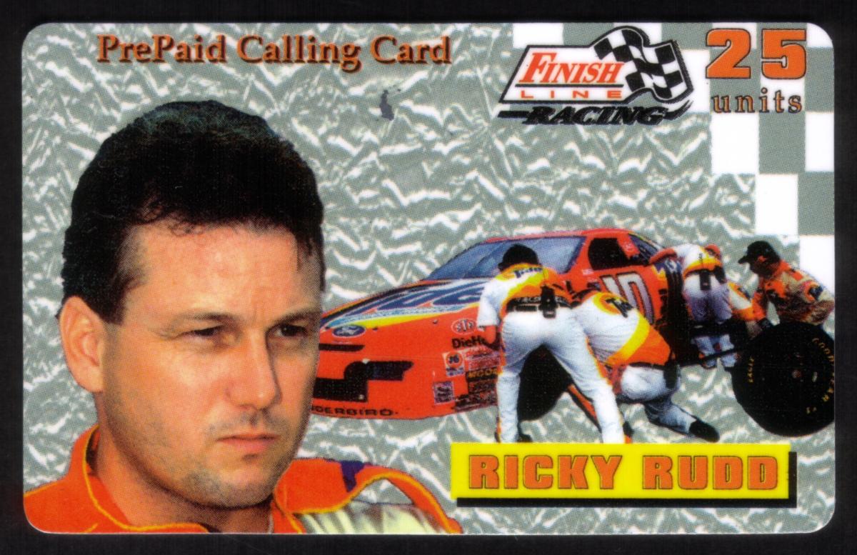 The card includes the Finish Line Racing logo at the top right, along with "25 units" printed in orange, indicating the card's value. The background has a silver and gray metallic pattern with a checkered flag design running vertically along the right edge. Ricky Rudd’s name is displayed in bold yellow text with a red outline beneath the pit stop image.