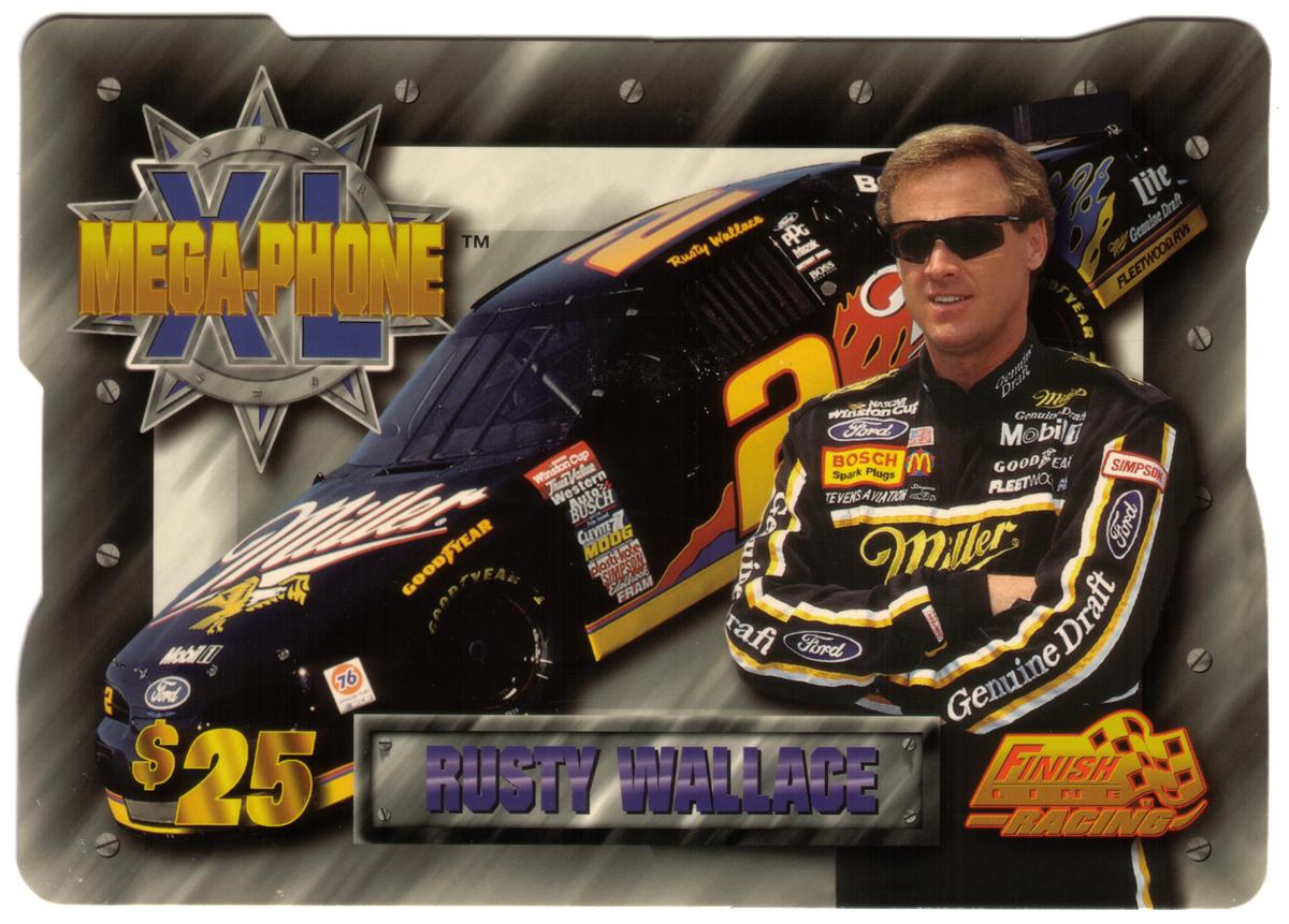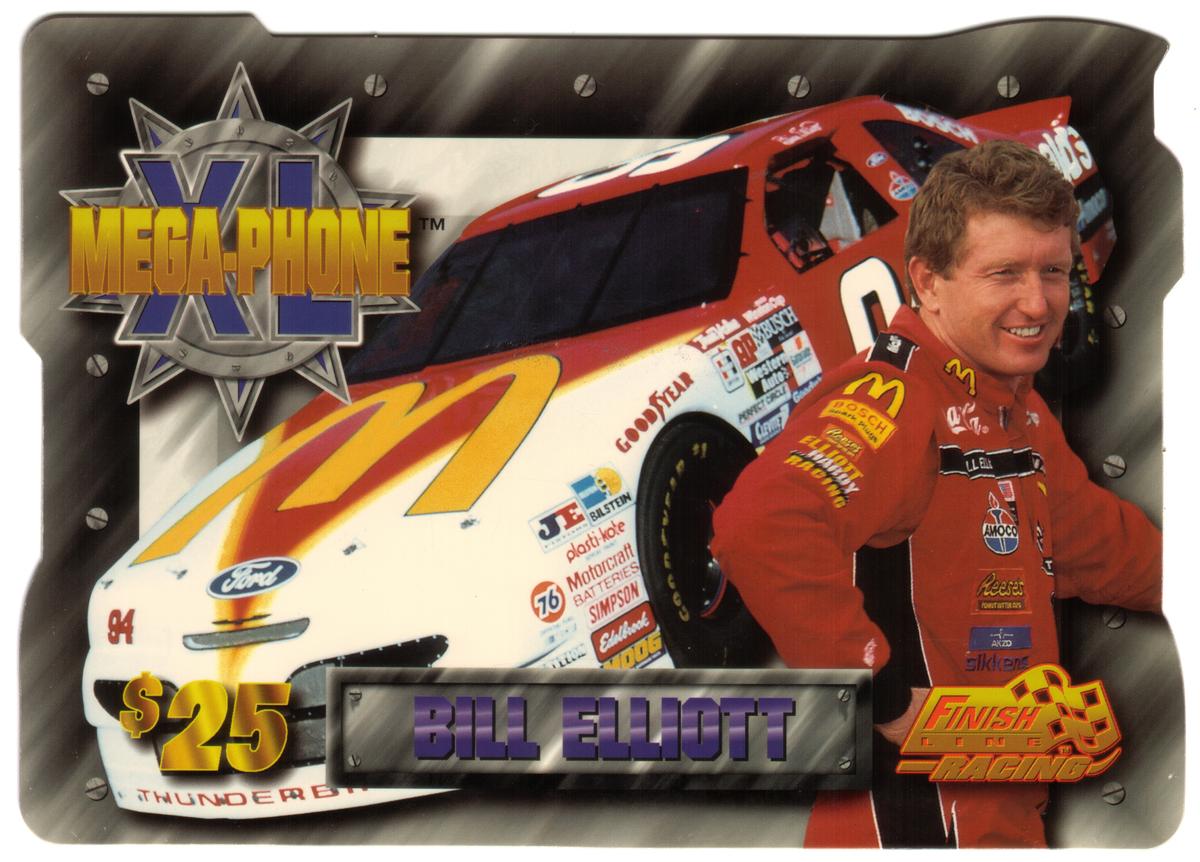 This set features four XL Mega-Phone Die-Cut Jumbo collectible cards from the 1996 Finish Line Racing series. Each card highlights a prominent NASCAR driver from that season, including Bill Elliott, Mark Martin, Jeff Gordon, and Rusty Wallace. The cards are shaped like oversized megaphones, emphasizing the die-cut design that makes them stand out from traditional rectangular cards.