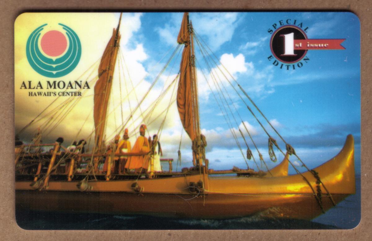 This collectible phone card features a detailed image of a traditional Hawaiian voyaging canoe sailing on open water during what appears to be late afternoon or early evening, with a partly cloudy sky overhead. The wooden canoe has tall masts with furled sails and several people onboard dressed in vibrant clothing. The vessel’s bow is prominently visible on the right side of the card, showcasing its curved, canoe-style design.