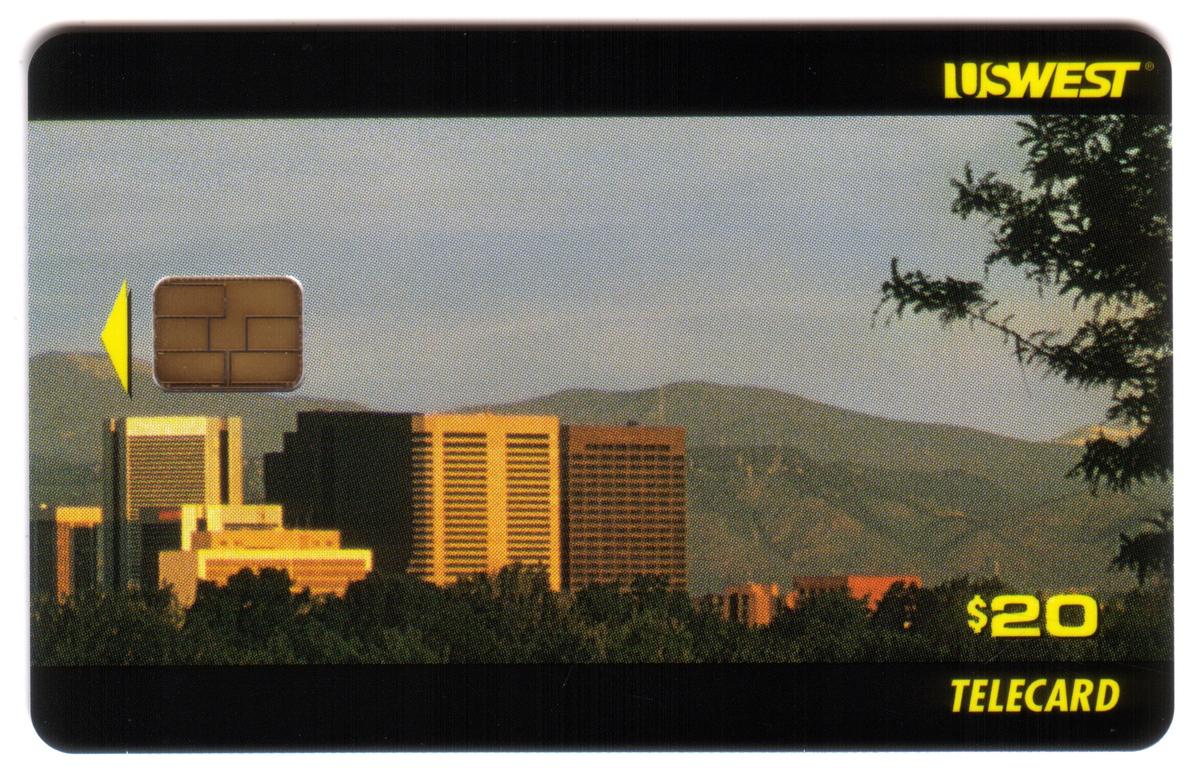 Printed values include a $20 denomination marked as U.S. West. Text on the card reads “Denver, Colorado” along with a designation referencing the Rocky Mountains. This card is part of the U.S. West Communication series and is numbered #7:3/3. The details present confirm this item as a phone card featuring the iconic scenery of Denver and the Rocky Mountain region.