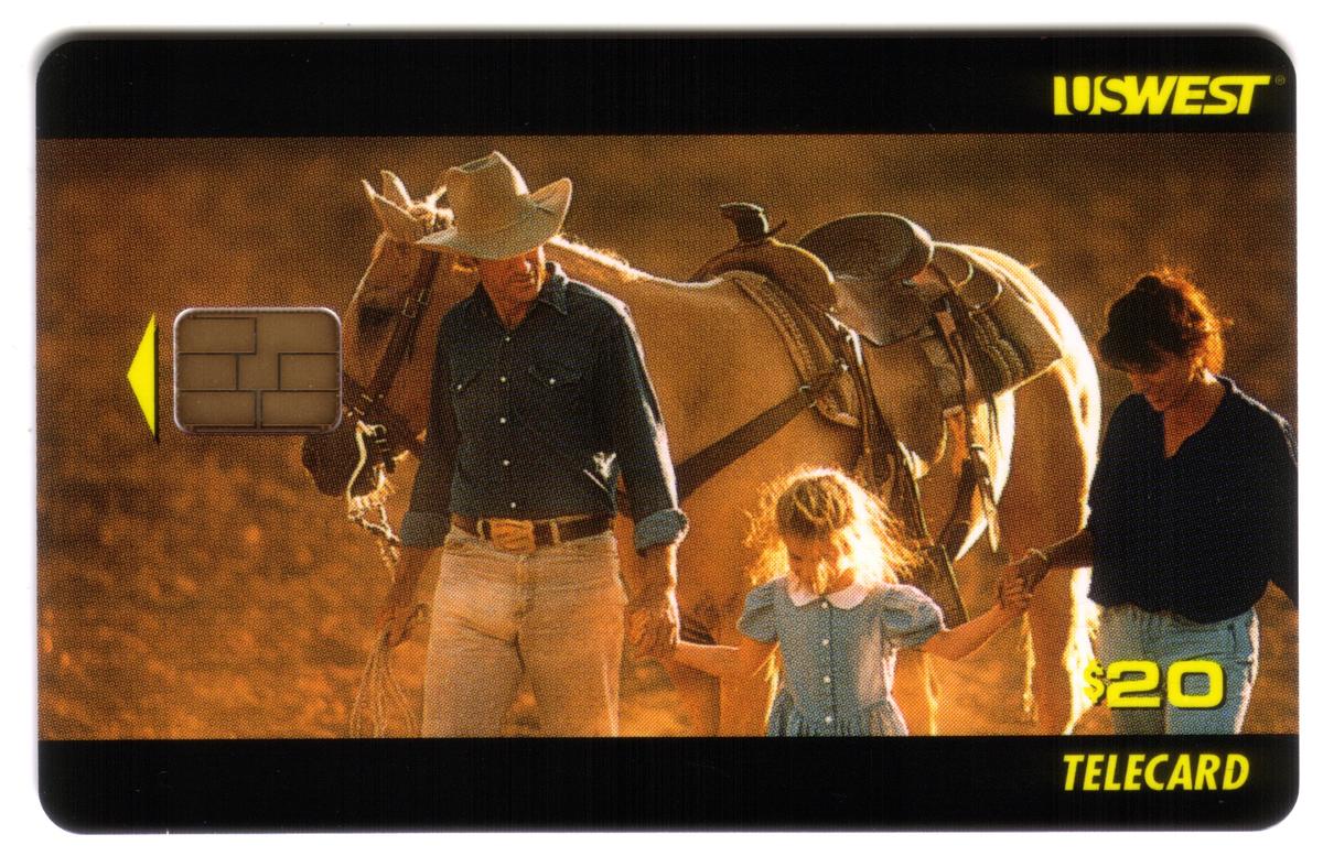 This collectible phone card features a scenic western heritage theme centered around horseback riding in Colorado. The image prominently displays a family group, consisting of a mother, father, and two young girls, all engaged in equestrian activities. The family is outdoors in a natural setting with clear skies above, embodying the spirit of the U.S. West. Horses are an essential part of the scene, highlighting the equestrian lifestyle that is part of Colorado’s cultural heritage.