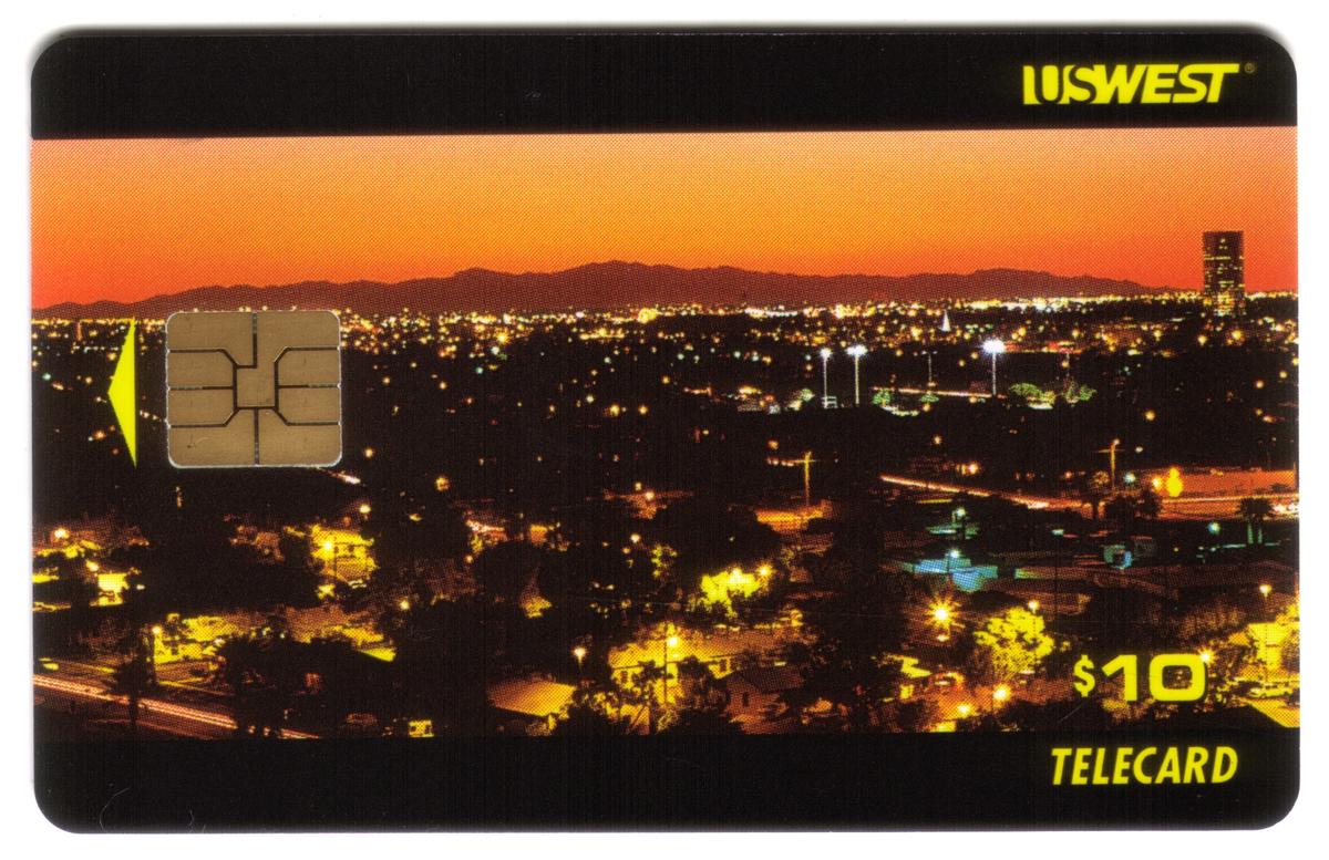 This collectible phone card features an aerial view of Phoenix, Arizona, showcasing the city’s skyline and the surrounding Valley of the Sun. The image captures key architectural elements and urban structures typical of Phoenix, with a backdrop of mountain ranges that frame the metropolitan area. The sky is clear and bright, emphasizing the expansive cityscape and natural setting of the U.S. West.