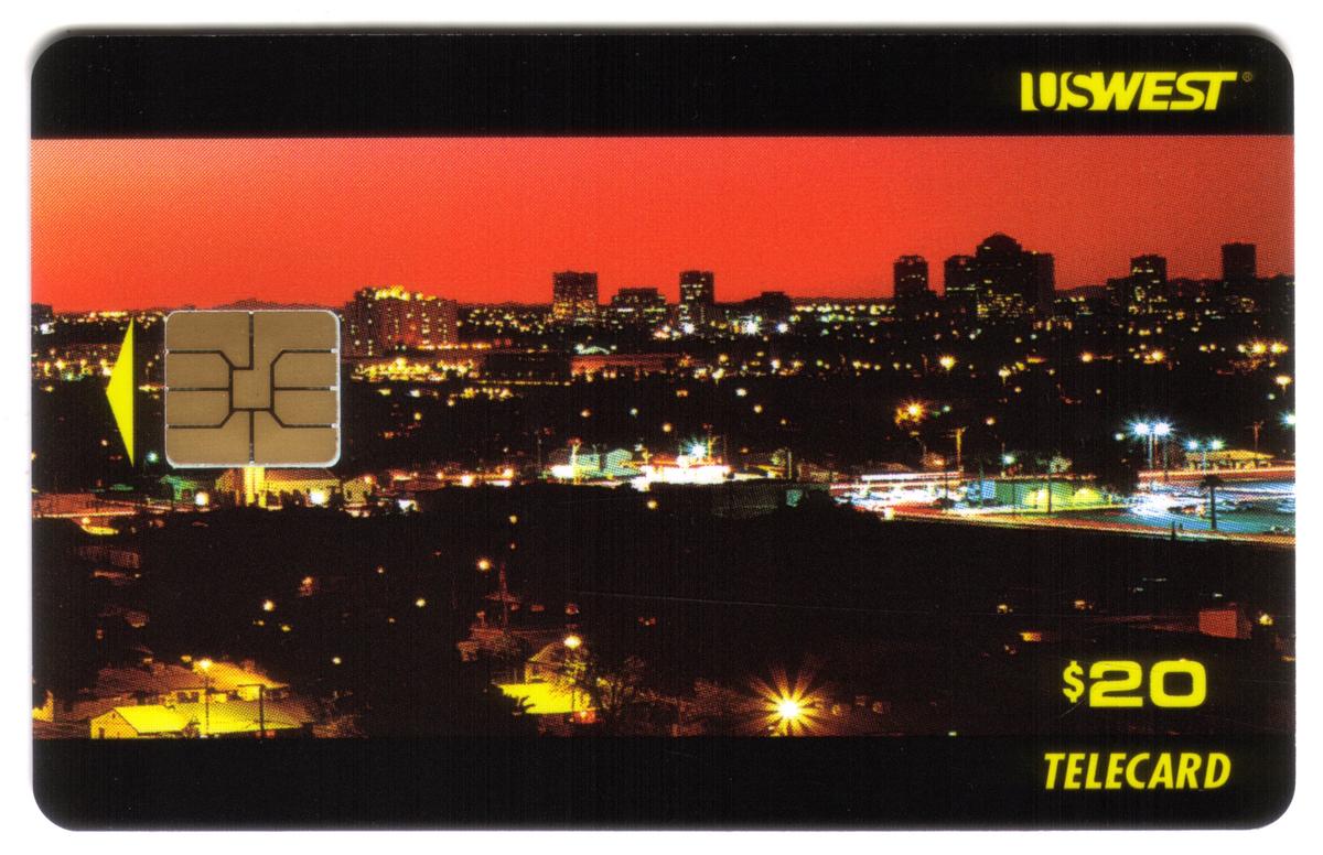 The card is part of the U.S. West Communications series, specifically identified as #9 in the set, with a denomination of $20. The scene highlights the architectural diversity of Phoenix’s downtown area, blending modern structures with the subtle glow of city lights beginning to emerge. The overall design emphasizes scenic and sightseeing elements, illustrating an iconic moment in a major southwestern U.S. city.