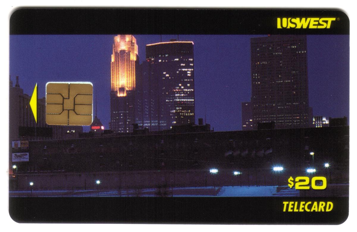 Overall, the card serves as both a functional phone card and a collectible item capturing an urban night scene in Minneapolis, featuring well-known buildings and professional photographic credit. The design integrates text and imagery clearly linked to the Minneapolis skyline and U.S. West Communications.