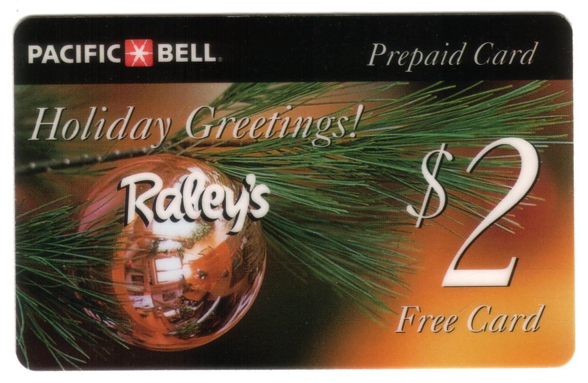 At the bottom right corner, the name “Pacific Bell” is shown, identifying the telecommunications provider linked to this phone card. The overall layout balances decorative holiday imagery with clear branding and promotional messaging, making it a collectible piece that marks Christmas celebrations in the mid-1990s.