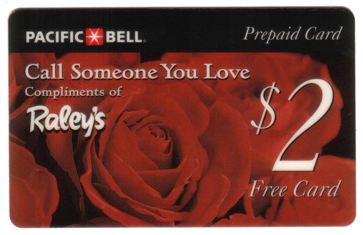 Prominently displayed on the card is a promotional value of $2. It also includes text stating “Free Card - Call Someone You Love (1995),” linking the card to a special promotional offering. The phone card is associated with Raley's Store and Pacific Bell, indicating its use and distribution through these companies. The logo for WorldCom is visible, confirming the issuing carrier for the phone service.