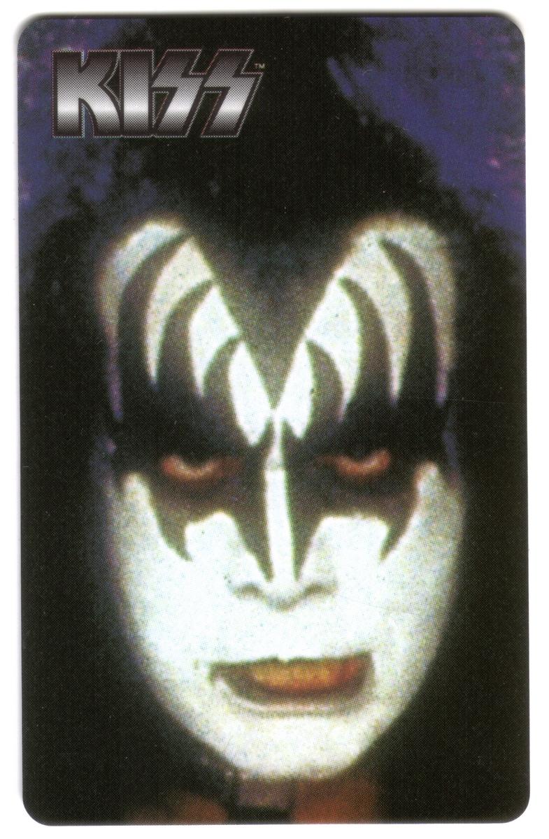 This collectible chip card features a vertical portrait of Gene Simmons, the iconic bassist and co-lead singer of the rock band KISS. The image captures Simmons in his signature stage makeup, emphasizing his dramatic persona within the rock 'n roll genre. The card showcases bold, graphic lettering at the top that reads "KISS Rock & Roll Band," highlighting the musical theme and the band's renowned status in entertainment.