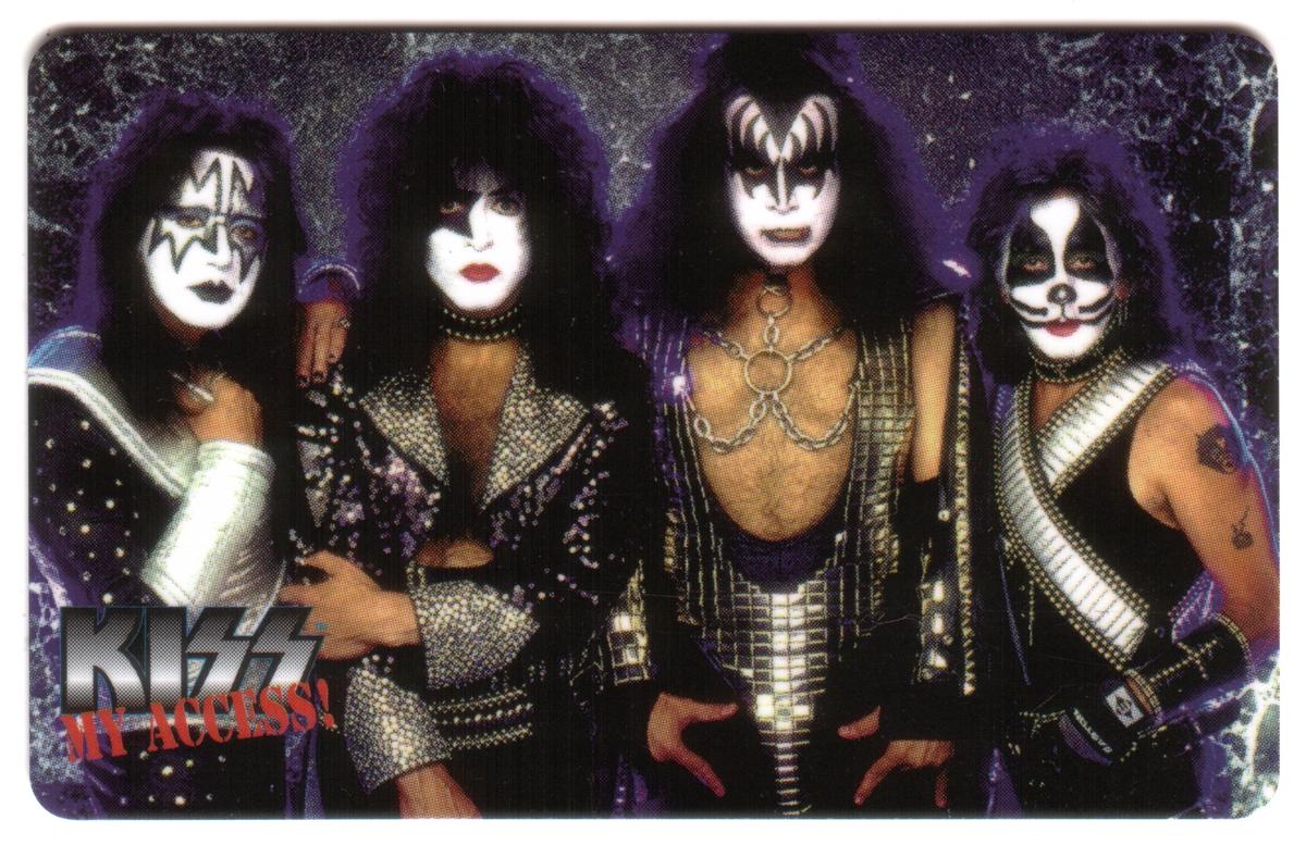This collectible phone card features the American rock band KISS, known for their theatrical stage presence and distinctive makeup. The image shows all four band members posing together. The band members include Paul Stanley, Gene Simmons, Ace Frehley, and Peter Criss, each in their iconic makeup styles. They are dressed in their classic rock costumes that reflect their established personas: the Starchild, the Demon, the Spaceman, and the Catman. The card highlights KISS’s connection to rock ’n roll music and entertainment.
