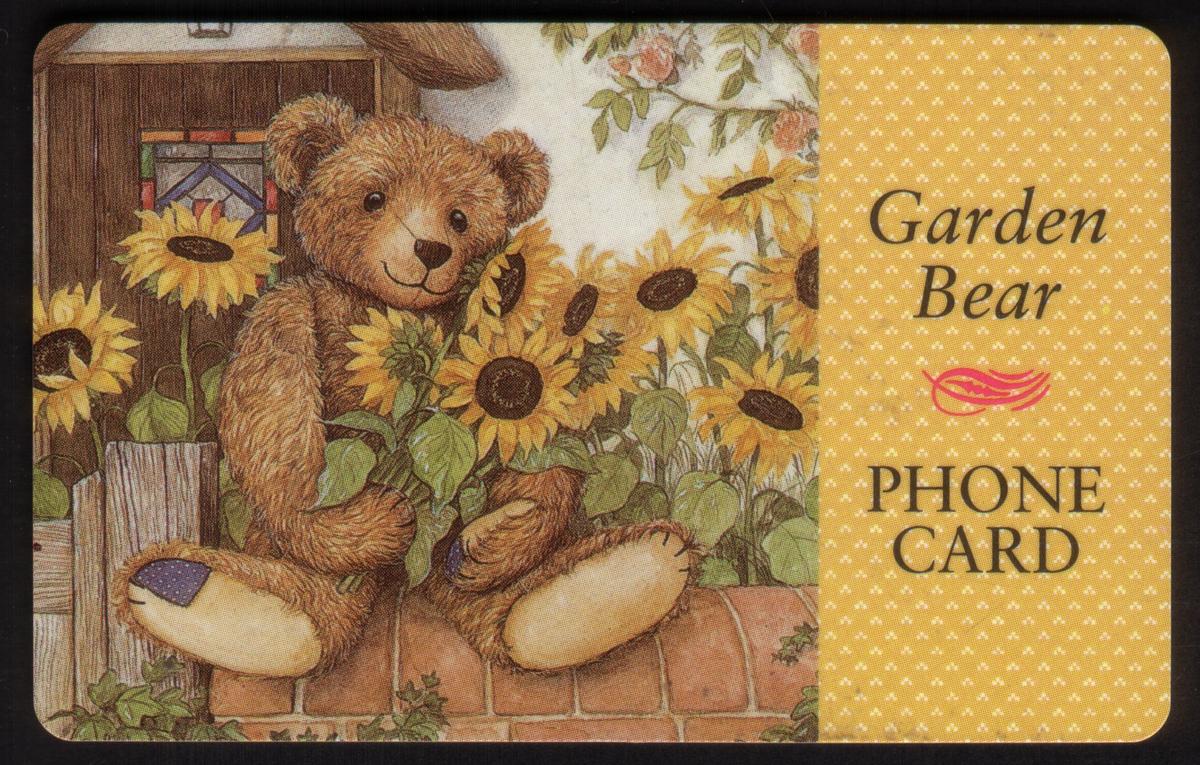 This phone card is focused entirely on the garden bear and sunflower scene, making it a charming collectible for those who appreciate stuffed animals and floral themes. The layout and design are straightforward, showcasing the bear and flowers prominently in the center with clear, legible text regarding its denomination and issuing company.