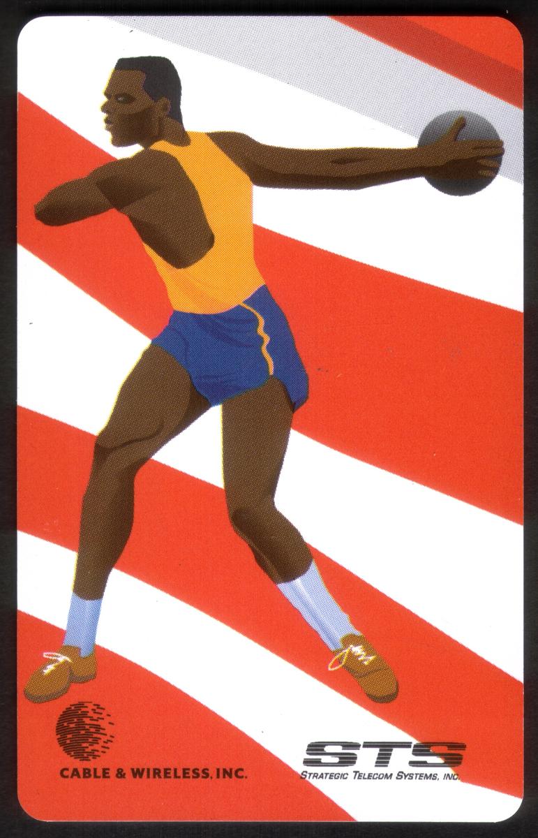 The card is part of the "Cable & Wireless 10m Reach For The Emerald Sports Collectors Series," as indicated by the text on the front. It includes clear labeling with the phrases "Cable & Wireless" and "10m Reach For The Emerald," along with the designation "Sports Collectors Series: Discus Thrower." The card also carries the branding of "Strategic Telecom Sys," linking it to its issuing entity.