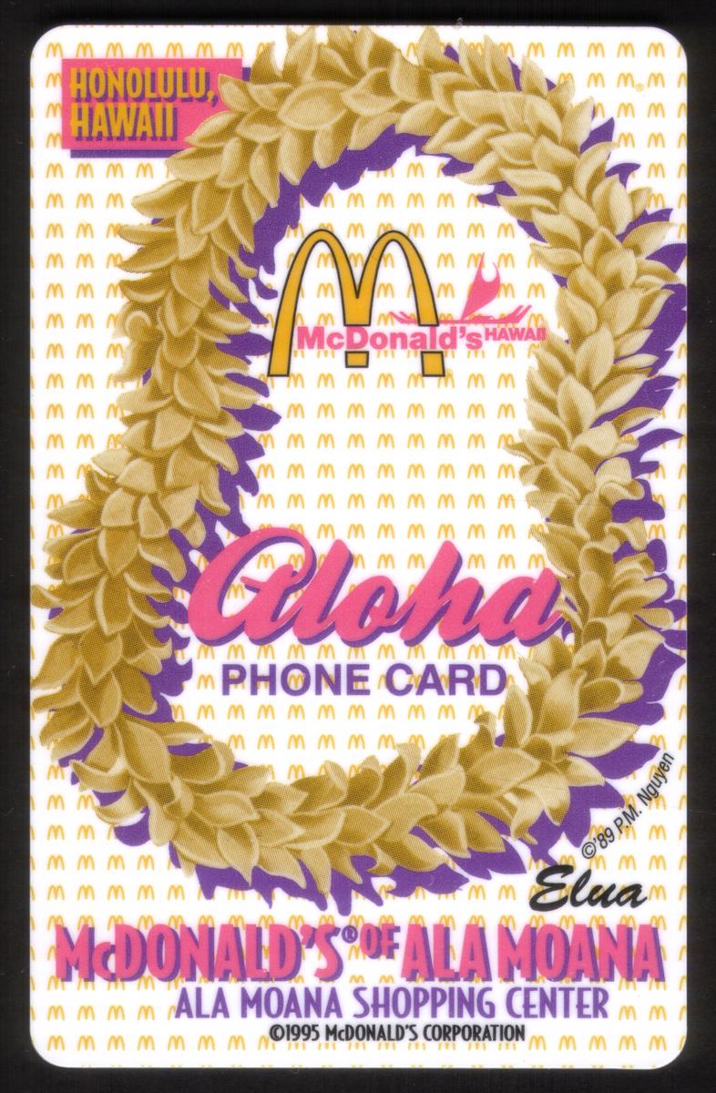 Overall, this phone card serves as a collectible highlighting McDonald’s presence in Hawaii, uniquely combining Hawaiian cultural symbols like the Plumeria lei with the internationally recognized Golden Arches branding. The card’s details make it a distinctive item for collectors interested in McDonald’s memorabilia or Hawaiian-themed phone cards.