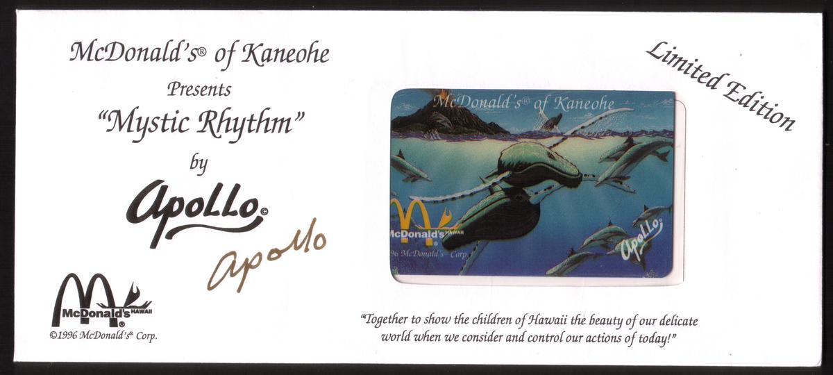 Keywords: McDonalds, McDonald's, Hawaiian Islands, fast food chains, restaurants, logos, golden arches, trademarks, fish, bottlenose dolphins, porpoises, whales, volcanos, mountains, sealife, artistic, sealife, autographed, signature, artwork, Phonecards Hawaii