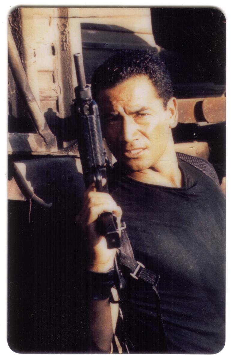 Temuera Morrison is dressed in a black shirt with a tactical harness and wrist strap visible, highlighting his readiness for combat. The lighting creates strong shadows across his face, enhancing the intense expression he wears as he grips the weapon firmly.