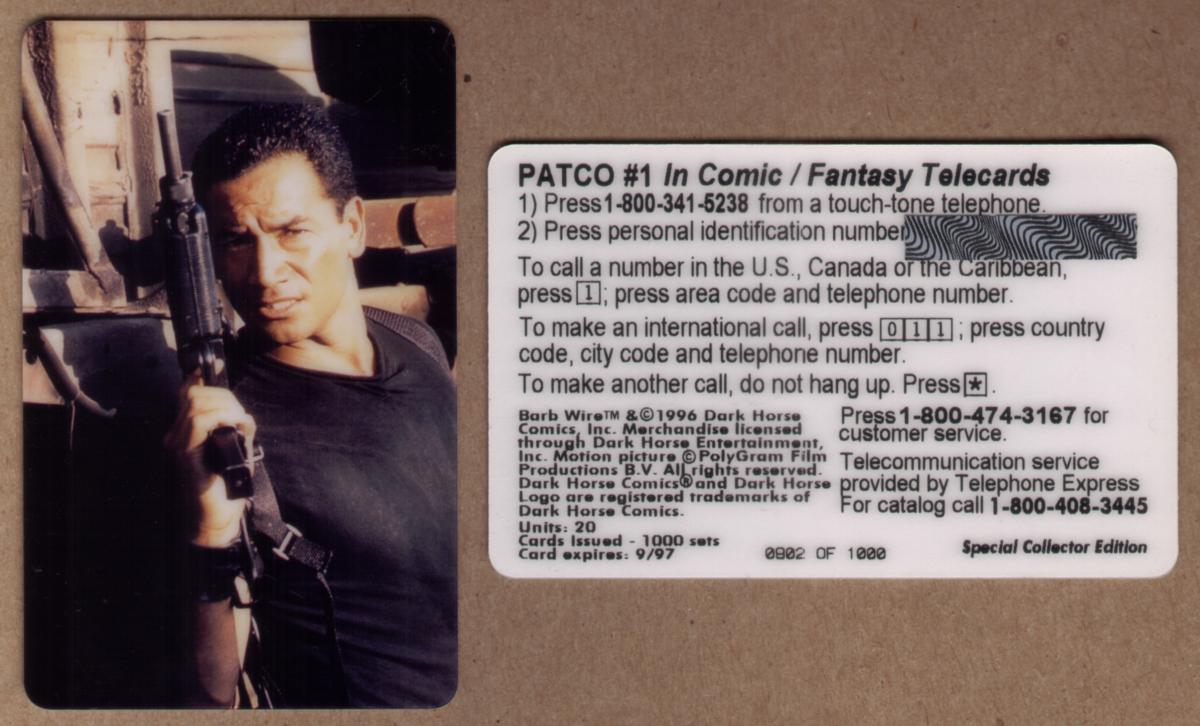 This phone card connects to keywords such as action adventure films, famous people, Hollywood, and automatic weapons, directly linking it to the "Barb Wire" movie scene featuring Temuera Morrison as Axel Hood with an automatic gun. The card represents collectible entertainment memorabilia tied to the actor and film.