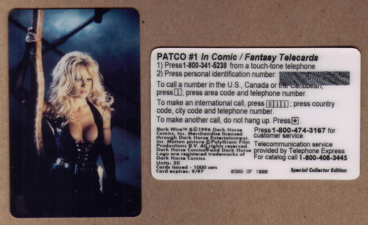 This collectible phone card features a striking image of Pamela Anderson from the movie "Barb Wire." She stands confidently, holding a large column or pillar with her right hand. Pamela Anderson is dressed in a black leather outfit with a plunging neckline and lace-up front detailing, complemented by a belt at her waist. Her iconic blonde hair is styled in voluminous curls, and she wears makeup that emphasizes her eyes and lips, fitting the bold, action-adventure theme of the film.