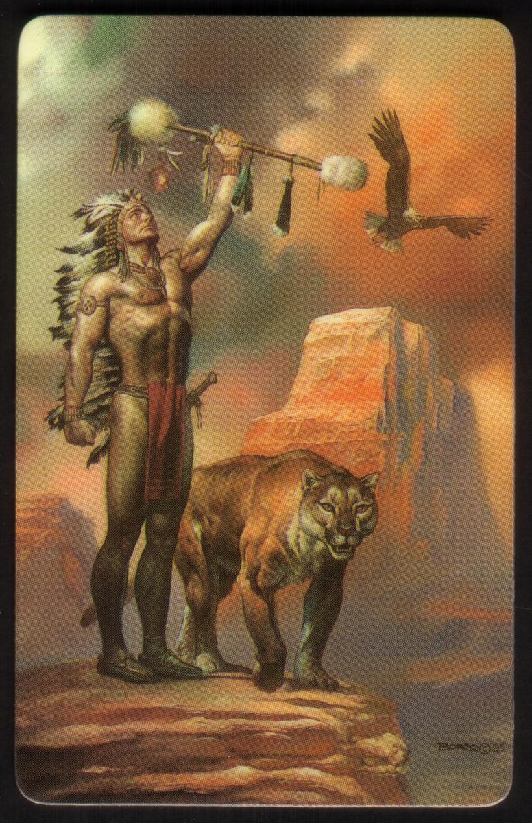 The scene blends elements of native culture, wildlife, and fantasy art, showcasing symbolic strength and spiritual presence. The use of warm tones highlights the dramatic sky and landscape, creating an atmospheric setting that enhances the mystic and heroic qualities of the characters. The artist's signature "Boris Vallejo" is visible at the lower right of the card.