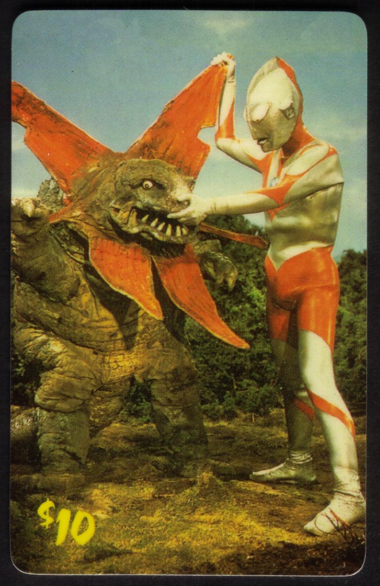 Ultraman battle scene with Eleking, vibrant colors, glossy finish, collectible prepaid phone card, featuring iconic tokusatsu imagery and functional details on the back. |