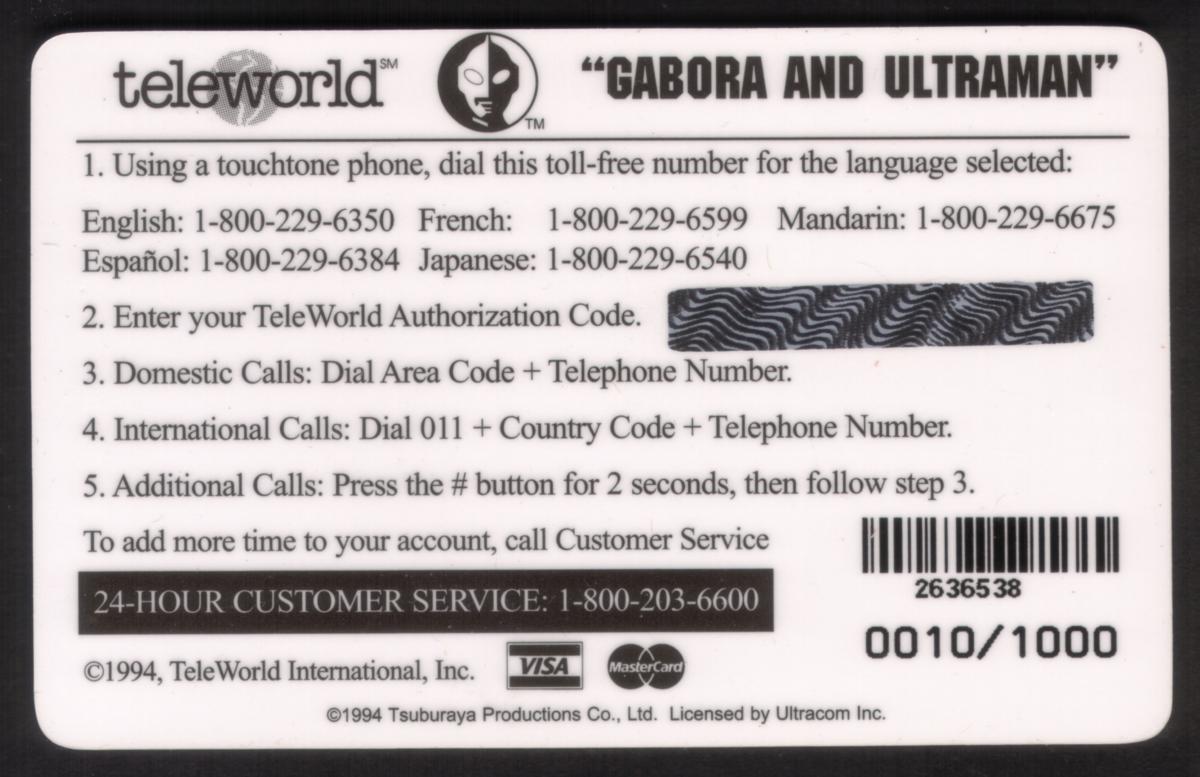 The phone card is produced by Teleworld International, as indicated by the card series name presented prominently. This card is part of a collectible series related to entertainment, specifically within TV shows, comics, and animation, featuring iconic figures from Japanese pop culture such as Ultraman and creatures like Gabora.