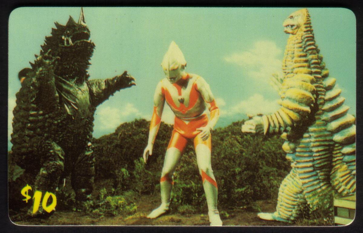 Vivid Ultraman scene featuring Ultraman, Gomora, and Eleking against a rocky landscape, with a $10 value and functional back for phone use. |
