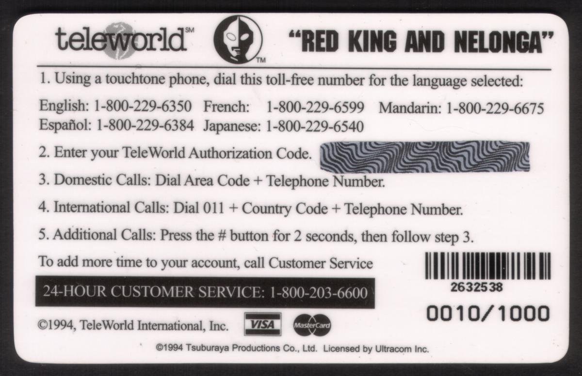 This collectible phone card features characters from the Ultraman Destination Earth series produced by Teleworld International. The image shows Ultraman in his iconic silver and red suit standing between two monsters: Red King and Nelonga. Ultraman is posing with a slightly crouched stance, facing the monster Nelonga on the right, who has a segmented, armored body with a ridged, snail-like appearance. Red King appears on the left, characterized by a dark, rugged, rock-like texture and a menacing stance with claws extended.