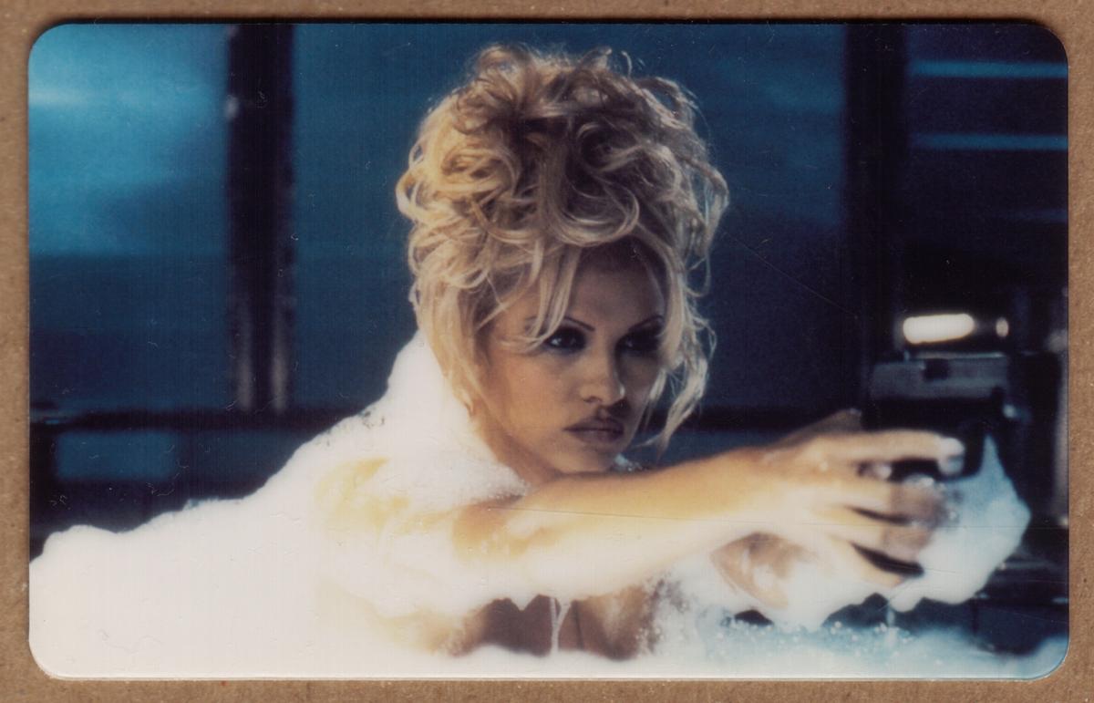 This phone card reflects a thematic connection to the Barb Wire franchise starring Pamela Anderson, featuring elements such as the telephone, gun, and soap bubbles, which together create a distinct and collectible presentation tied to this promotional release.