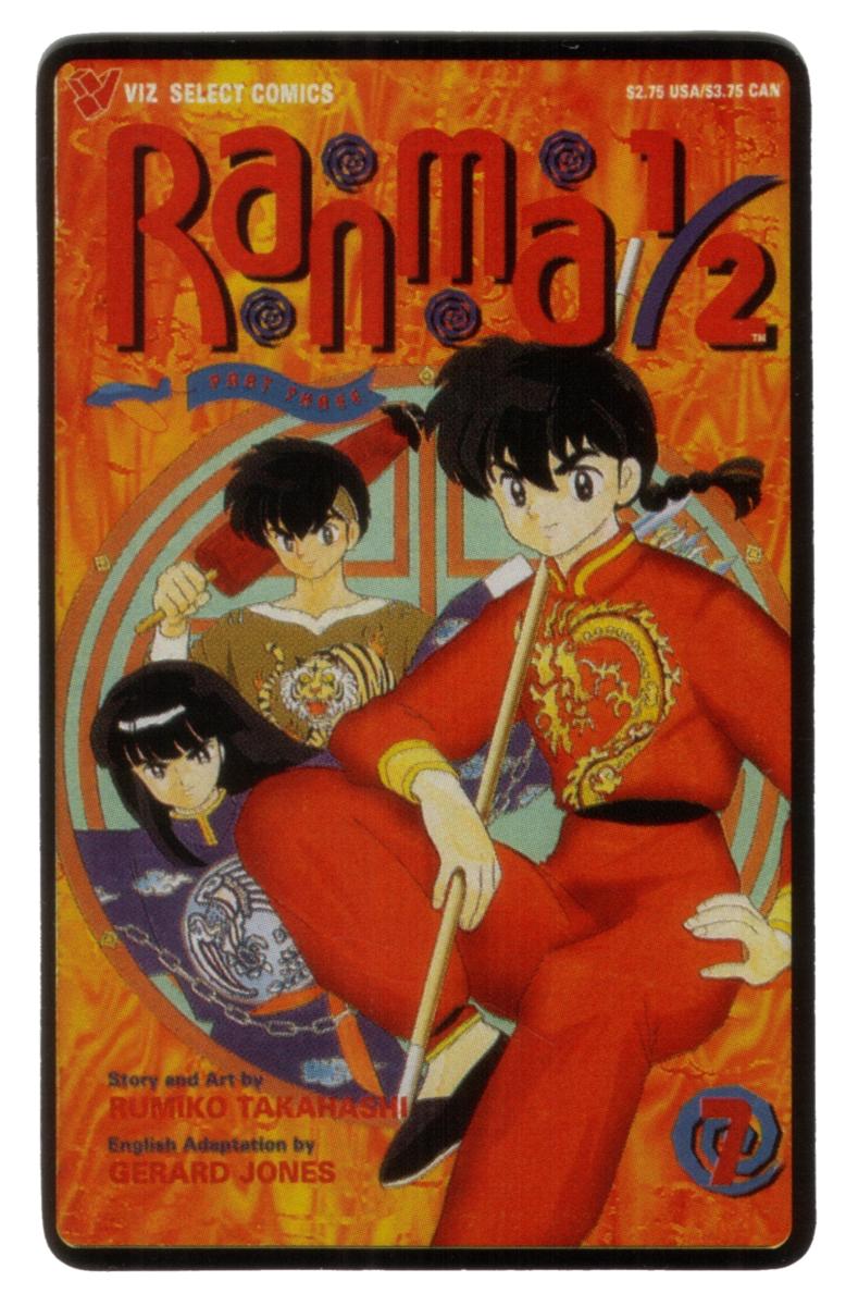 This collectible phone card features fantasy artwork by Rumiko Takahashi, showcasing characters from the Ranma ½ series. The artwork presents Ranma Saotome in his red uniform, positioned prominently in the center of the card. The vibrant colors highlight the dynamic style of Japanese comics (manga), reflecting the iconic look of the series as featured in Viz Comics and Shogakukan publications.