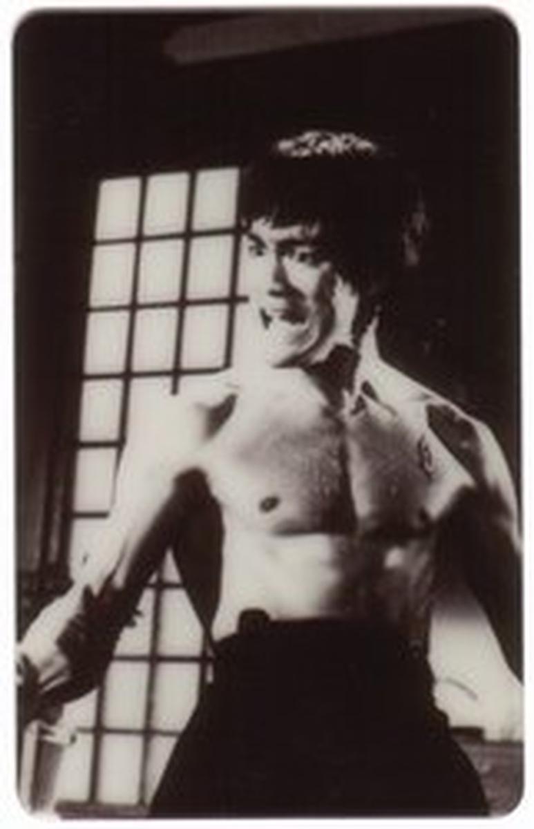 The card combines elements of sports and movies, emphasizing Bruce Lee’s legacy in martial arts and cinema. No other text or graphics interrupt the clean presentation of Bruce Lee’s image and the associated logos. The card is a collectible item for fans of Bruce Lee, martial arts history, and film memorabilia.