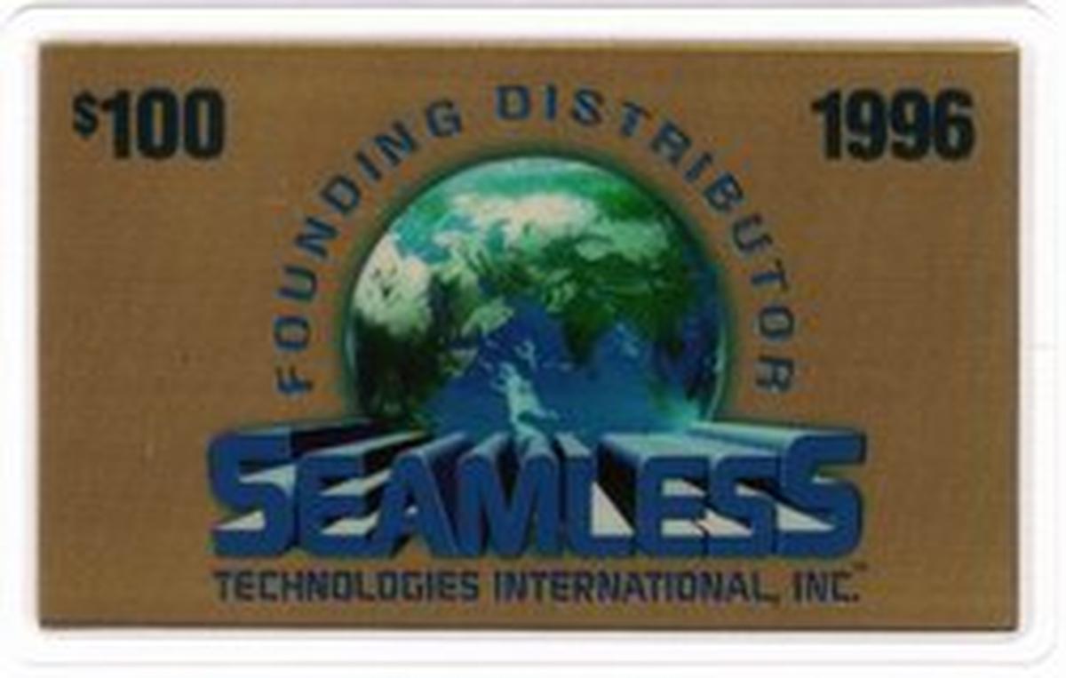 Overall, the card embodies a unique blend of collectible and financial symbolism through its use of text and imagery, with no other logos or identifiers beyond those already stated. The clear presentation of "Founding Distributors" and "Seamless Technologies" anchors the card’s identity in the realm of collectible gold cards tied to multi-level marketing.
