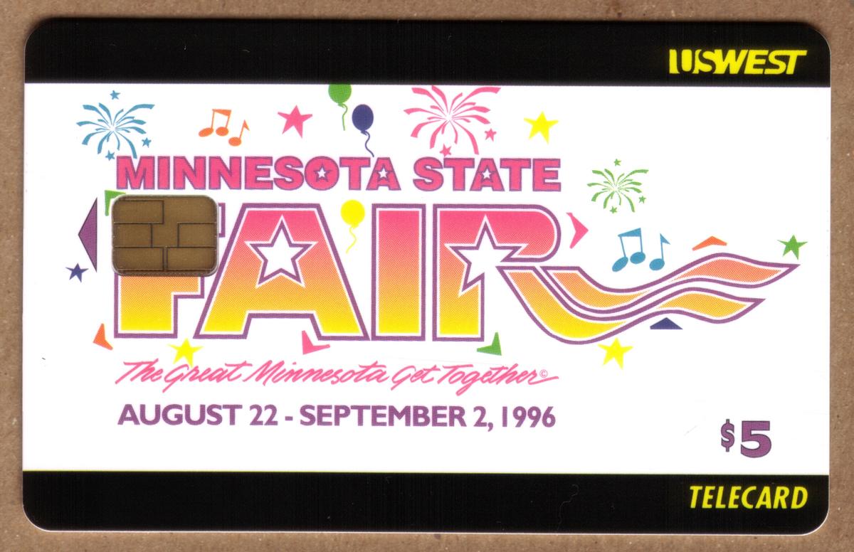 Overall, the card celebrates the cultural and entertainment aspects of the Minnesota State Fair, showcasing fireworks, balloons, and music through vivid and appealing artwork. The inclusion of U.S. West branding marks it as a regional collectible associated with the US West telecommunications services.